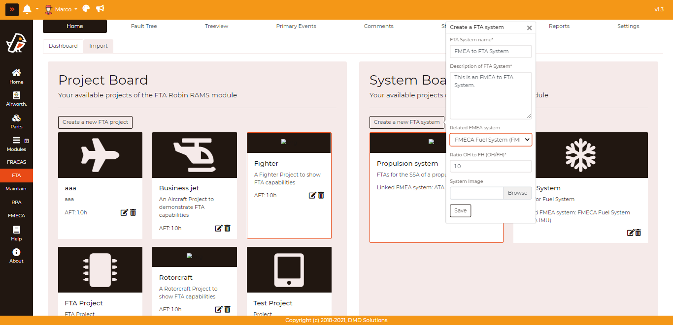 To begin, the user has to create a new FTA System within the project they are working on and link an FMEA System. In the “Create a FTA System” modal, after filling in all required fields, the user simply has to choose the FMEA system they wish to link under the Related FMEA System dropdown menu.