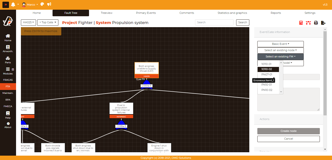Finally, they must click on Select an existing FM and choose the desired part, represented by their respective part numbers and their names as tooltips. Once one of these are chosen and Create Node is clicked, the linked node is added to the FT.