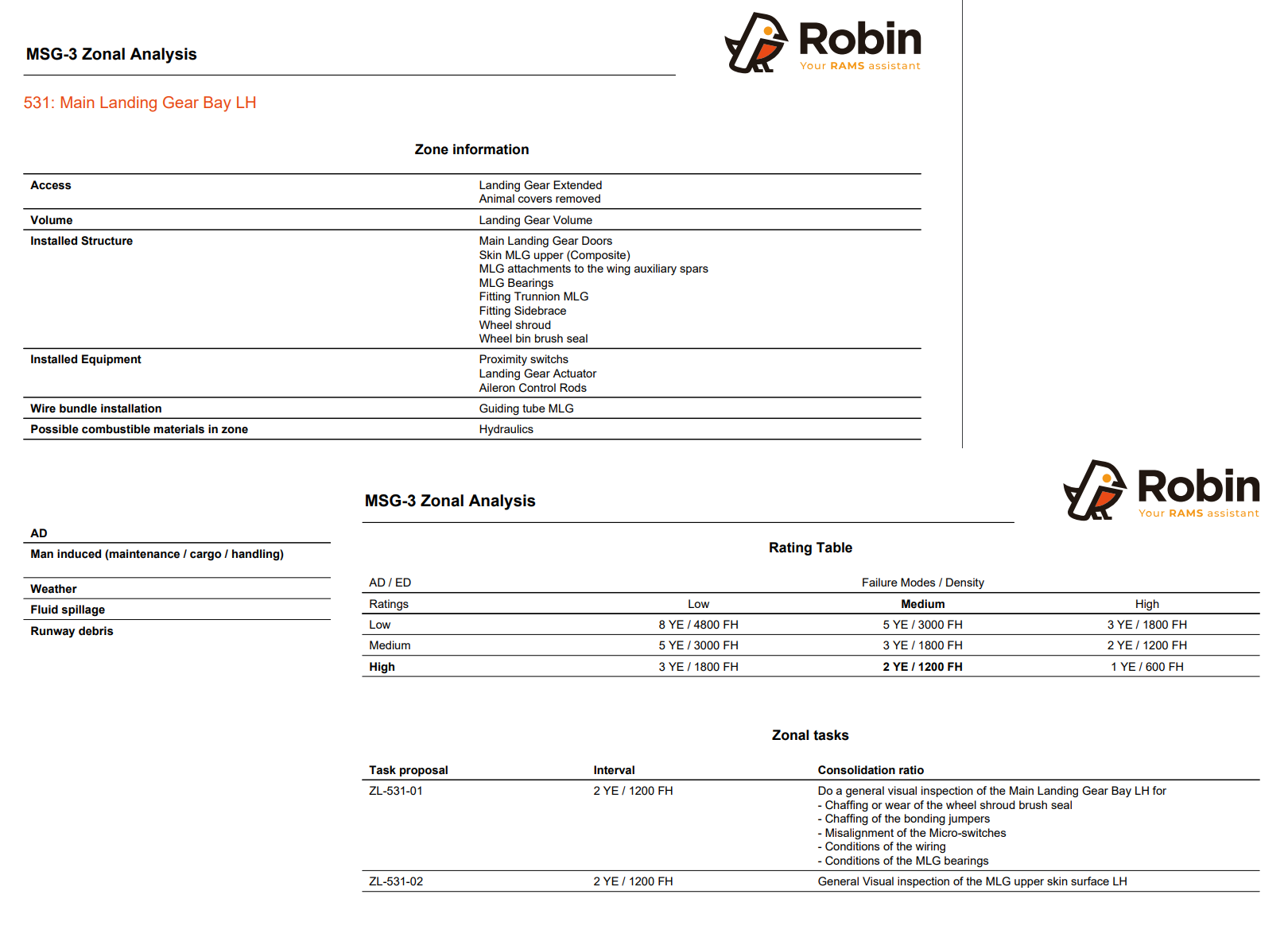 Robin allows to print a report about the MSG-3 Zonal Analysis Procedure. It contains all the zone with its corresponding information. It also contains all the analysis performed with the resulting interval. Also, all the tasks related to each zone are listed:
