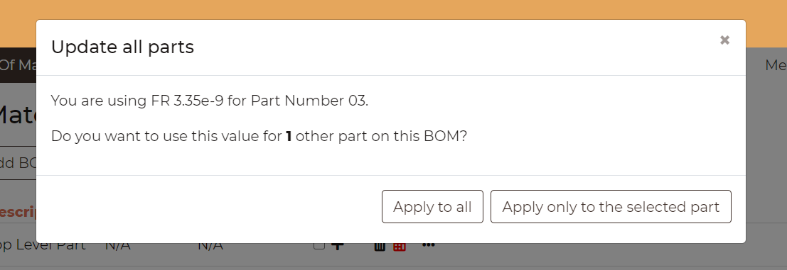 When a calculation is done on a PN which has been already computed, Robin automatically selects and introduces the data corresponding to the first calculation, easening the data introduction for the user, allowing them to focus only on the changes. Furthermore, if there is more than one entry for the same Part Numer in the BOM, e.g. two identical resitors, Robin will ask the user if they want to keep the original value for the rest of items or substitute the failure rate for the recently computed value.
