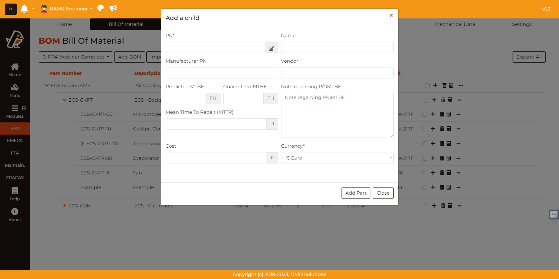 Add a child: Action to add an item below a node of the BOM. The fields that are necessary to fill are the same as in FRACAS.