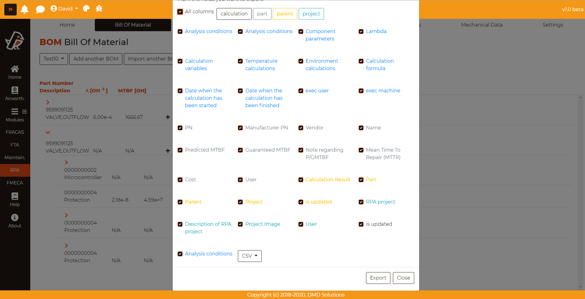 By clicking on the icon “Export BOM”, the BOM can exported either in “CSV” or “Excel” format:
