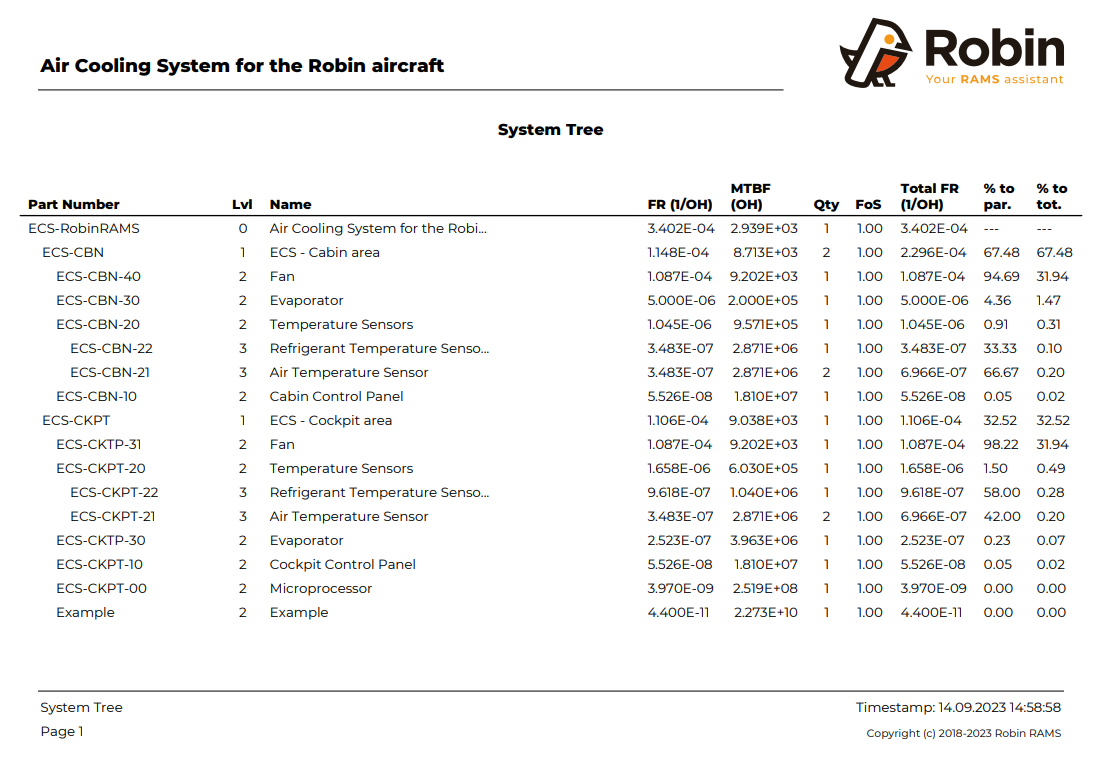 System Tree: The hierarchy (levels) of the BOM is presented. Moreover, the overall contribution of each item to the failure rate is also given